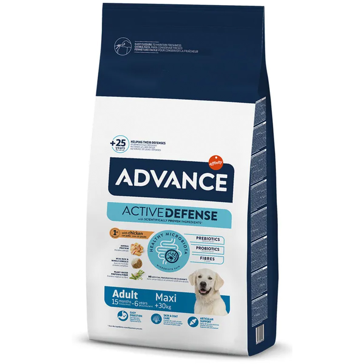 Η Advance Maxi Adult έχει ειδική σύνθεση που παρέχει στο σκύλο σας όλα τα θρεπτικά συστατικά που χρειάζεται σε καθημερινή βάση. Η ξηρά τροφή υποστηρίζει το δέρμα και το τρίχωμα του τετράποδου φίλου σας με απαραίτητα λιπαρά οξέα και μπορεί να μειώσει τον κίνδυνο σχηματισμού πέτρας χάρη στα ειδικά μέταλλα. Η μεγάλη κροκέτα είναι επίσης ειδικά προσαρμοσμένη στα σαγόνια των μεγαλύτερων φυλών σκύλων.