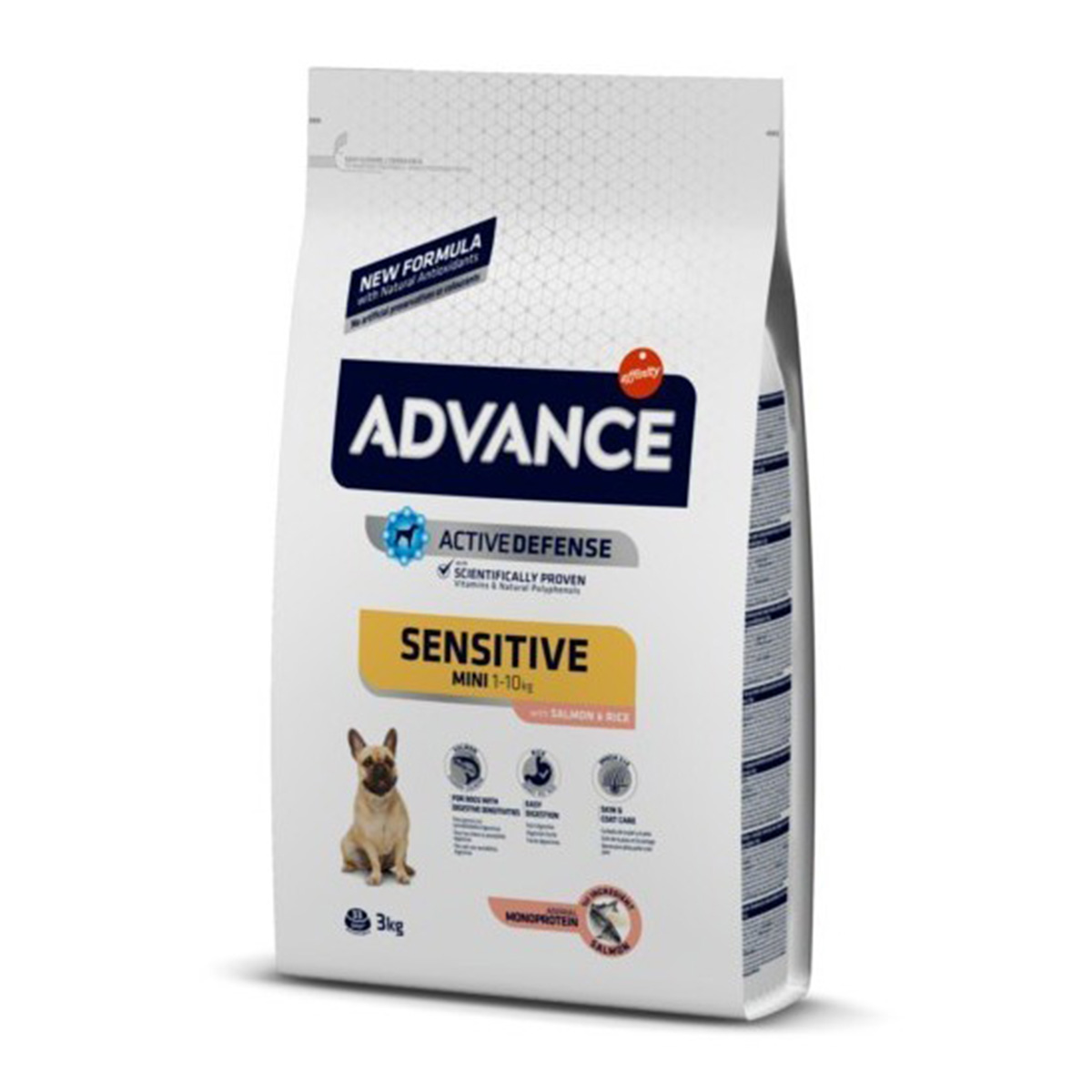 Μικρή ράτσα, μεγάλες απαιτήσεις! Αν ο τετράποδος φίλος σας έχει ευαίσθητο πεπτικό σύστημα, το Advance Mini Sensitive είναι ακριβώς το σωστό γεύμα! Η ξηρά τροφή για ενήλικες σκύλους περιέχει σολομό ως μοναδική πηγή ζωικής πρωτεΐνης και είναι ιδανική αν το κατοικίδιό σας είναι ευαίσθητο σε άλλες πρωτεΐνες.