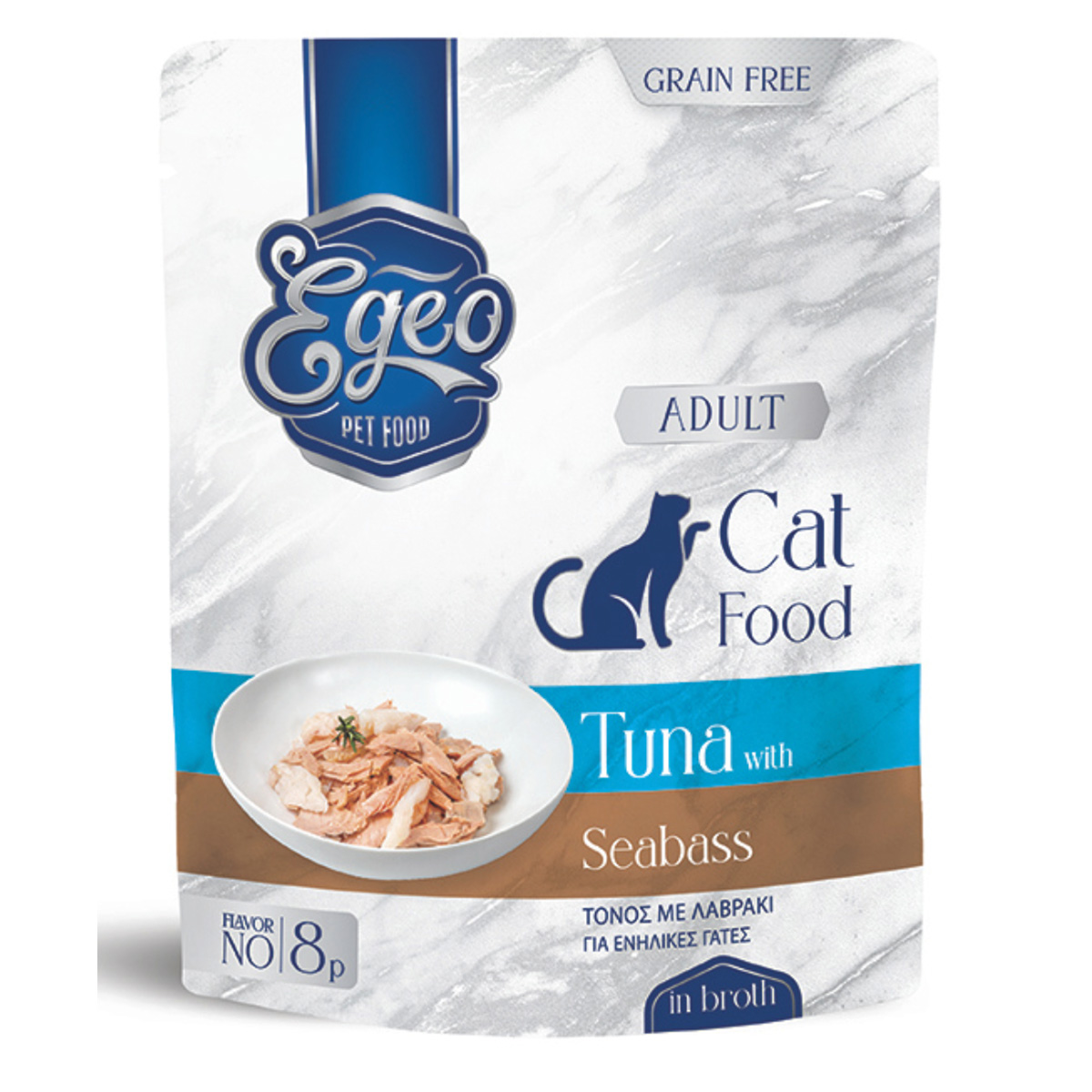 Πλήρης υγρή τροφή για ενήλικες γάτες με τόνο και λαβράκι σε ζωμό. Η Egeo Pet Food Adult Cat Tuna with Seabass είναι grain free σύνθεση, ειδικά σχεδιασμένη για καθημερινή διατροφή, με υψηλή περιεκτικότητα σε ποιοτική ζωική πρωτεΐνη από ψάρια. Τα φιλέτα τόνου και λαβρακιού σε ζωμό προσφέρουν εξαιρετική γευστικότητα και φυσική υφή, ενώ συμβάλλουν στην ενυδάτωση της γάτας. Κατάλληλη για γάτες που προτιμούν ελαφριά γεύματα με βάση το ψάρι, χωρίς δημητριακά.