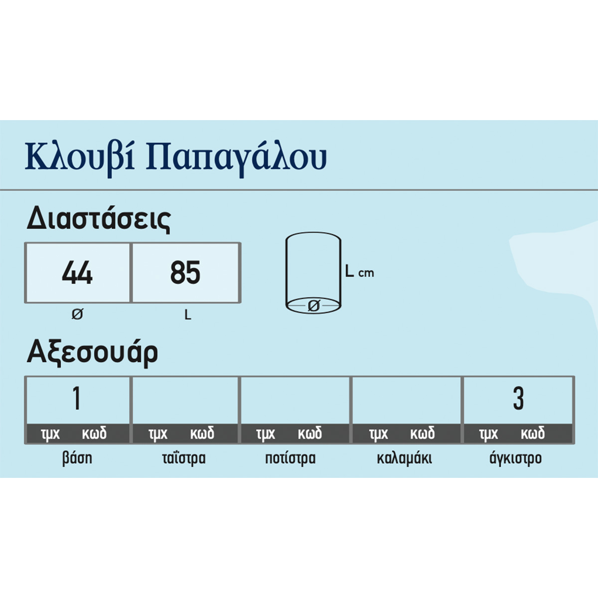 Κλουβί παπαγάλου στρογγυλό, κατάλληλο για φιλοξενία παπαγάλων και μεσαίου μεγέθους πτηνών. Διαθέτει μεταλλική κατασκευή με ανθεκτικό πλέγμα, που προσφέρει ασφάλεια και άνεση στο πουλί, ενώ επιτρέπει καλό αερισμό και καλή ορατότητα. Η βάση είναι αποσπώμενη, διευκολύνοντας τον καθαρισμό και τη σωστή υγιεινή του κλουβιού. Στο επάνω μέρος διαθέτει κρίκο ανάρτησης, επιτρέποντας την τοποθέτηση του κλουβιού είτε κρεμαστά είτε σε σταθερή επιφάνεια. Ο σχεδιασμός του το καθιστά πρακτικό για καθημερινή χρήση και εύκολη συντήρηση.