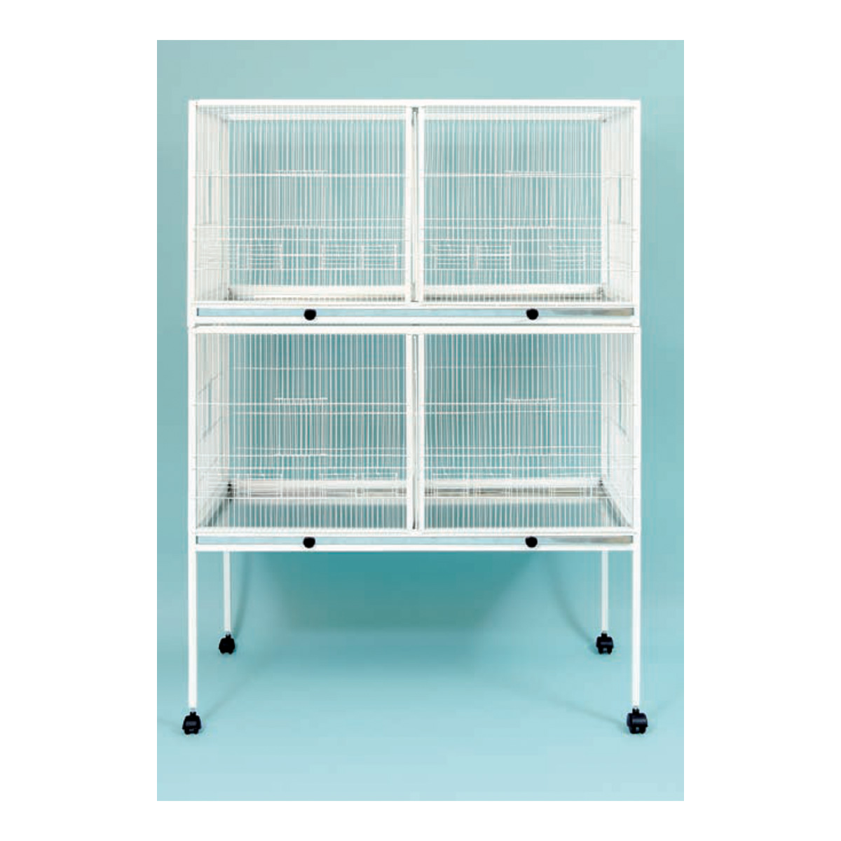 Διόροφη τροχήλατη κλούβα με συρτάρι, σχεδιασμένη για άνετη φιλοξενία πτηνών και εύκολη μετακίνηση στον χώρο. Ιδανική για εκτροφείς και επαγγελματική χρήση.