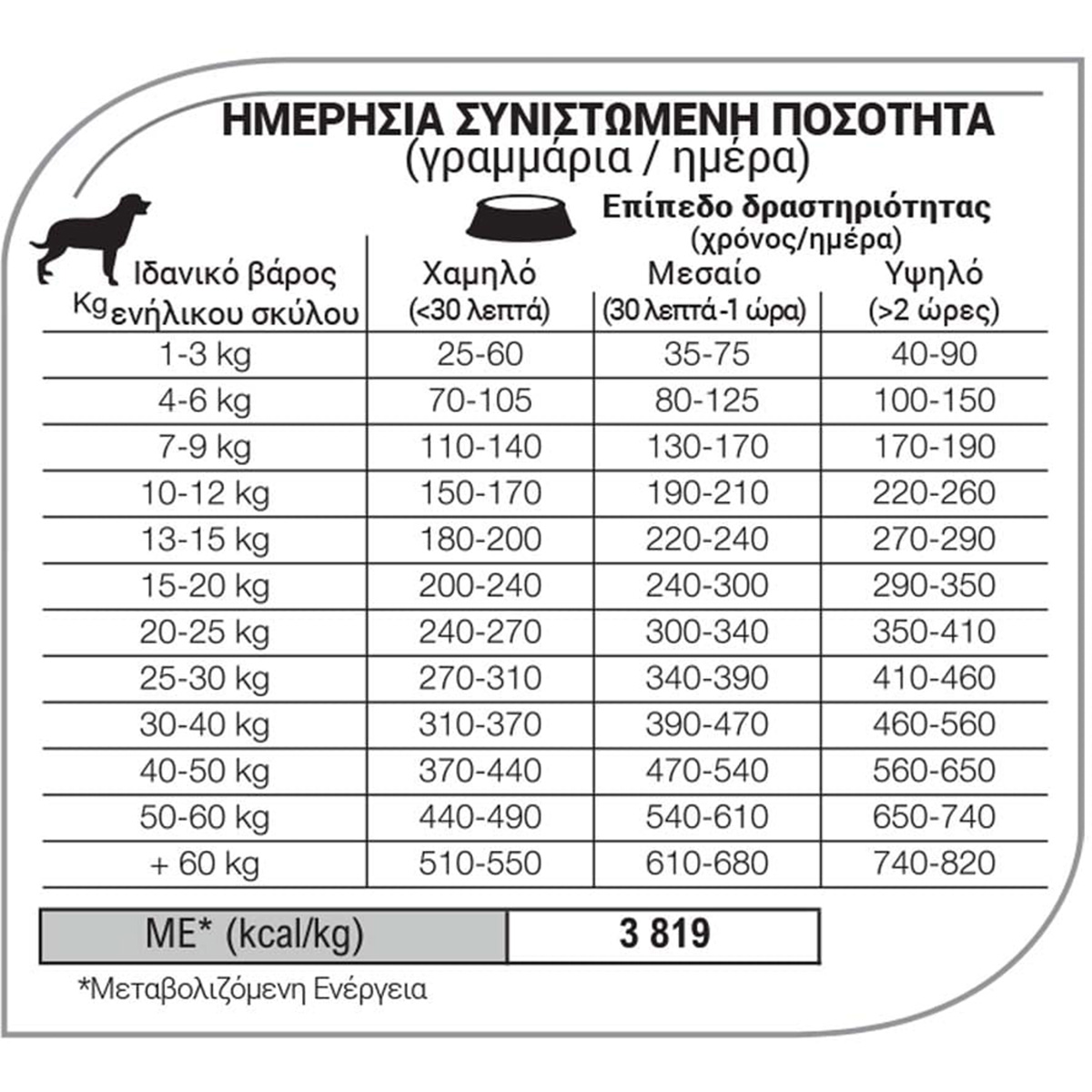 Aκατέργαστη Πρωτεΐνη 25%, Ακατέργαστες Λιπαρές ουσίες 17%, Ακατέργαστες Ινώδεις ουσίες 2,5%, Ακατέργαστη Τέφρα 7%, Ασβέστιο 1,3%, Φώσφορος 1%. – Aνά kg: Ωμέγα-3 λιπαρά οξέα: 3g, Ωμέγα-6 λιπαρά οξέα: 30g.