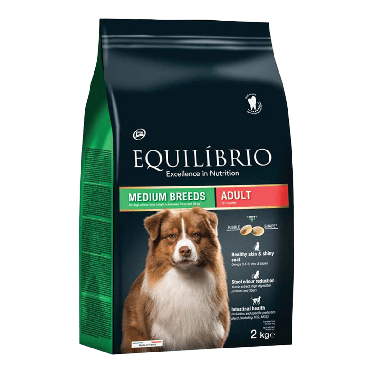 Η ξηρά τροφή Equilibrio Adult Medium Breed with Poultry & Rice  (Πουλερικά – Ρύζι) είναι μια πλήρης τροφή με πουλερικά και ρύζι για τον ενήλικο σκύλο σας, μεσαίου μεγέθους. Οι φρουκτοολιγοσακχαρίτες προάγουν την ανάπττυξη της ωφέλιμης εντερικής βακτηριακής χλωρίδας του μικρού σας φίλου, ενώ το σελήνιο και η βιταμίνη E συμβάλλουν στο να έχει το σκυλάκι σας γερό ανοσοποιητικό σύστημα. Τα Ωμέγα-3 και Ωμέγα-6 λιπαρά οξέα, προάγουν την υγεία του δέρματος και του τριχώματος.  Τέλος, το μέγεθος και το σχήμα της κροκέτας βοηθούν στη μείωση του σχηματισμού πλάκας και στην καλή στοματική υγεία.