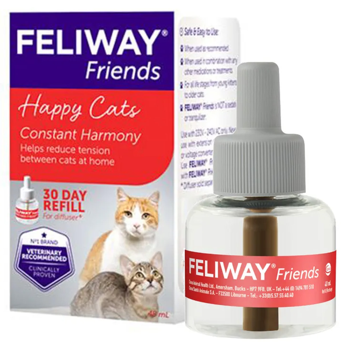 Το βαποριζατέρ FELIWAY®-FRIENDS περιέχει μια συνθετική απομίμηση της κατευναστικής φερομόνης για γάτες (C.A.P.), που στη φύση ενισχύει το δεσμό μεταξύ της μητέρας γάτας και των μικρών γατών και δημιουργεί ένα αίσθημα θαλπωρής. Ο ηλεκτρικός ψεκαστήρας διαχέει αποτελεσματικά τη συγκεκριμένη φερομόνη στον περιβάλλοντα χώρο.