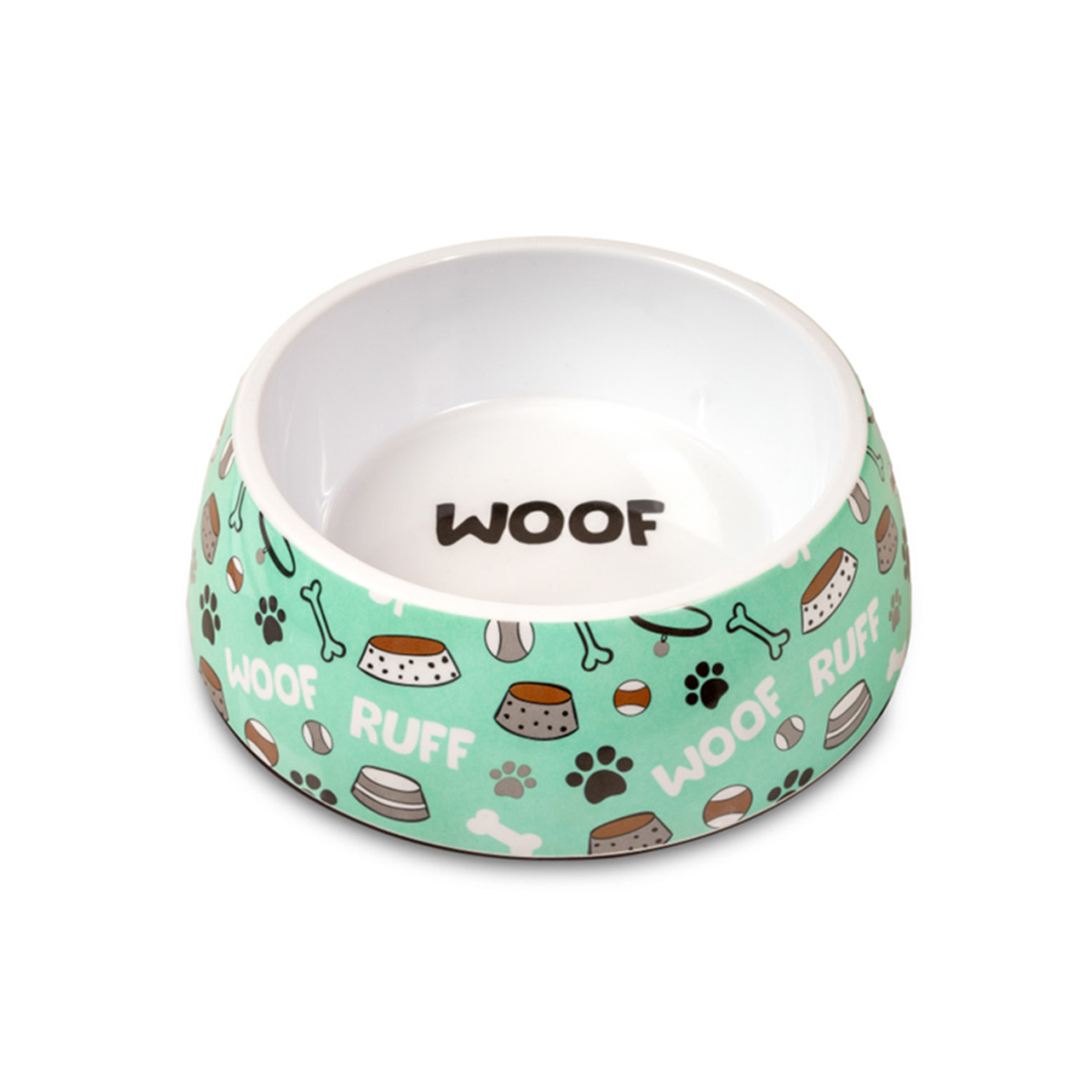 Μεσαίου μεγέθους μπολ φαγητού και νερού από μελαμίνη με παιχνιδιάρικο σχέδιο Woof Ruff, κατάλληλο για κατοικίδια μεσαίου μεγέθους. Η χωρητικότητα 500 ml εξασφαλίζει άνετη και πρακτική καθημερινή χρήση.