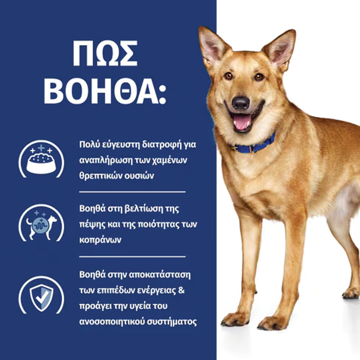 Η Hill’s Prescription Diet i/d Μαγειρεμένο γεύμα για Σκύλους είναι τροφή με υπέροχη γεύση που έχει αποδειχθεί κλινικά ότι βοηθά στη μείωση των πεπτικών διαταραχών. Αυτή η πολύ εύπεπτη τροφή είναι εμπλουτισμένη με ηλεκτρολύτες και βιταμίνες B για διασφάλιση της εύκολης απορρόφησης των θρεπτικών ουσιών και της αναπλήρωσης των θρεπτικών ουσιών που χάθηκαν. Ενισχυμένη με ωμέγα-3 & ωμέγα-6 λιπαρά οξέα και κλινικά αποδεδειγμένα αντιοξειδωτικά για βοήθεια στην υποστήριξη ενός υγιούς ανοσοποιητικού συστήματος. Η Hill’s Prescription Diet i/d Τροφή για Σκύλους έχει ειδική σύνθεση για βοήθεια στη μείωση των πεπτικών διαταραχών και ικανοποιεί τις ειδικές διατροφικές ανάγκες σε κουτάβια και ενήλικους σκύλους.