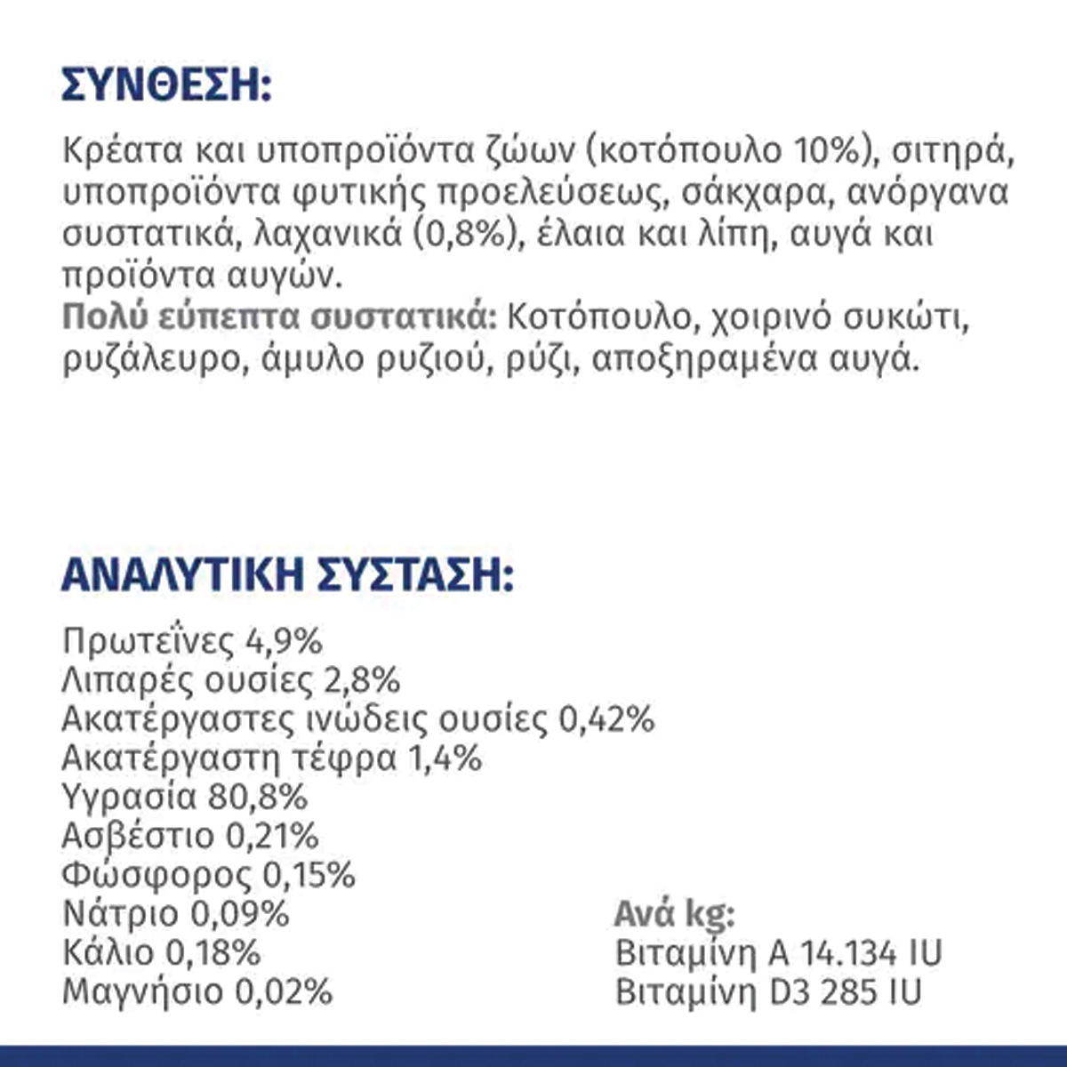 Κρέας και ζωικά παράγωγα (κοτόπουλο 10%), δημητριακά, παράγωγα φυτικής προέλευσης, ποικίλα σάκχαρα, ανόργανα συστατικά, λαχανικά (0.8%), έλαια και λίπη, αυγά και παράγωγα αυγών