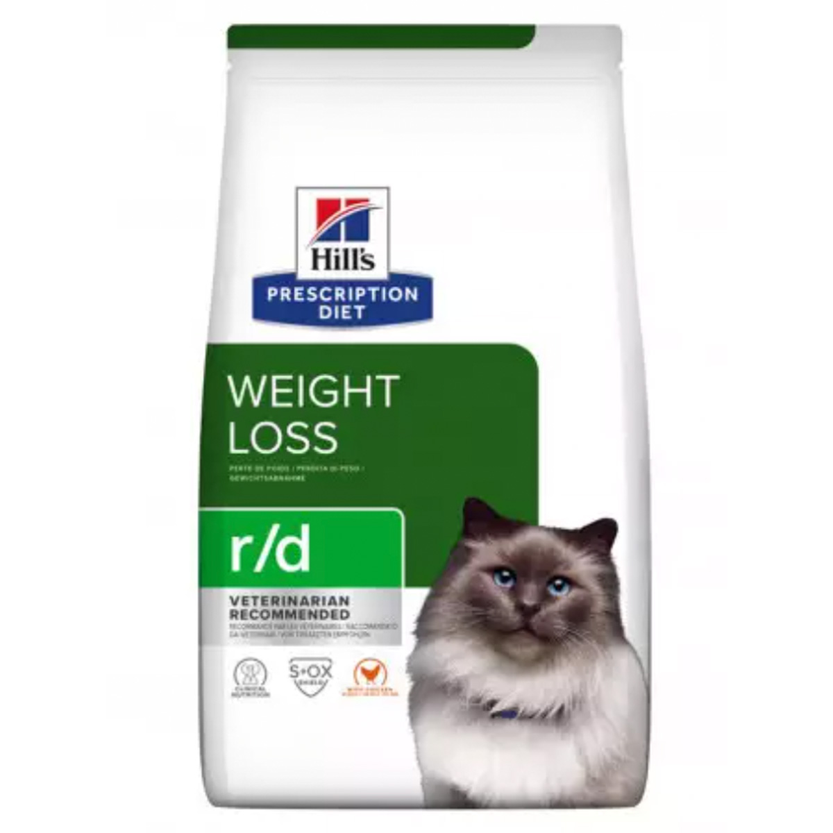 Οι διατροφολόγοι και οι κτηνίατροι της Hill’s έχουν αναπτύξει την κλινική διατροφή Prescription Diet r/d, ειδικά σχεδιασμένη για να προάγει την απώλεια βάρους στις γάτες. Στην πραγματικότητα, η r/d είναι κλινικά αποδεδειγμένη διατροφή για υγιή απώλεια βάρους σε μόλις 4 εβδομάδες. Αυτή η ξηρά τροφή παρασκευάζεται με κοτόπουλο και έχει μια ακαταμάχητη γεύση που η γάτα σας θα λατρέψει.