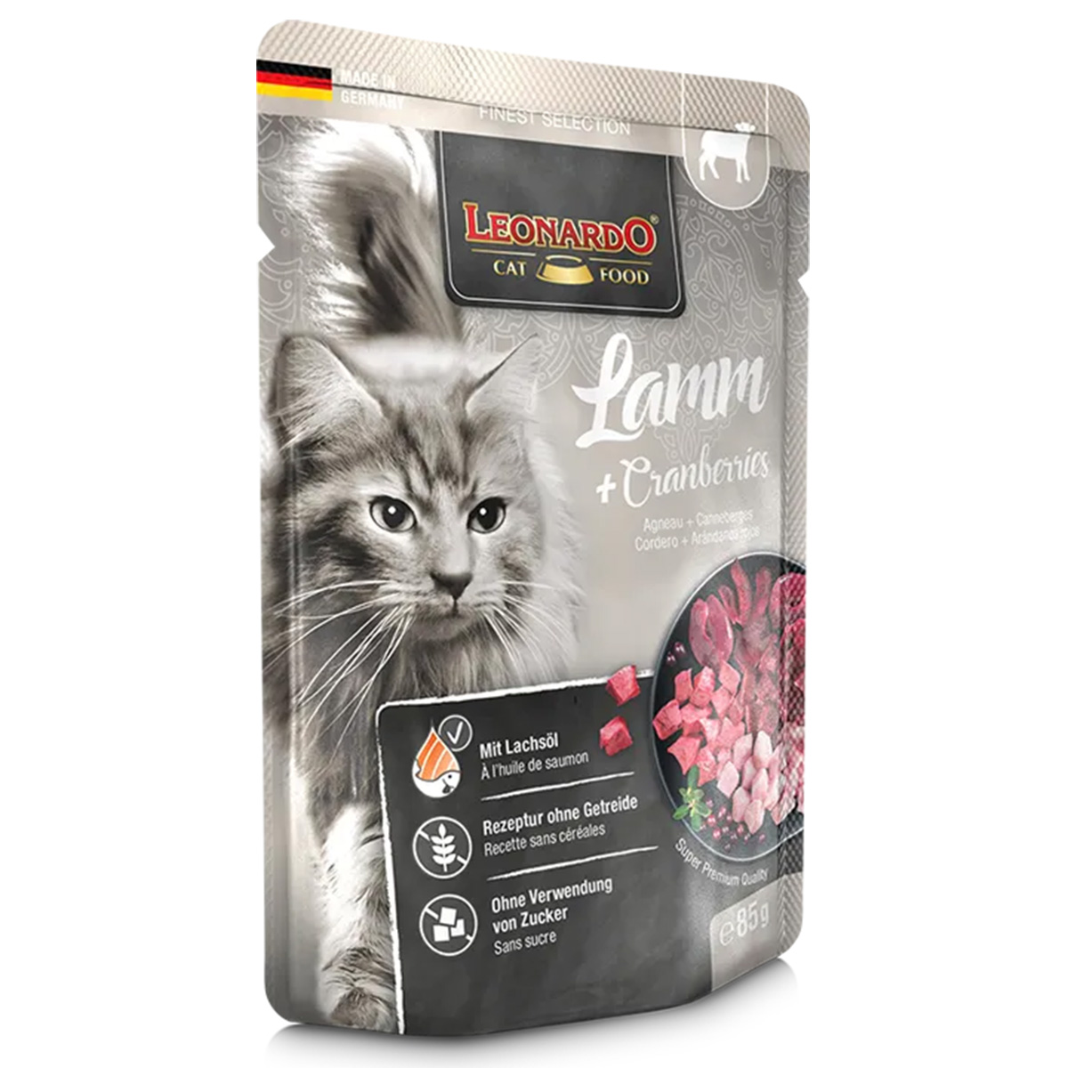 Άριστος συνδυασμός από εύπεπτο αρνί, ποιοτικά πουλερικά και κόκκινα «θαυματουργά» μούρα πλούσια σε θρεπτικά συστατικά και κατάλληλα για το ευαίσθητο στομάχι της γάτας. Τα cranberries είναι γεμάτα με αντιοξειδωτικά και βιταμίνες. Το LEONARDO Lamb + Cranberries περιέχει λάδι σολομού, παρέχοντας πολυακόρεστα λιπαρά οξέα για γυαλιστερό τρίχωμα.