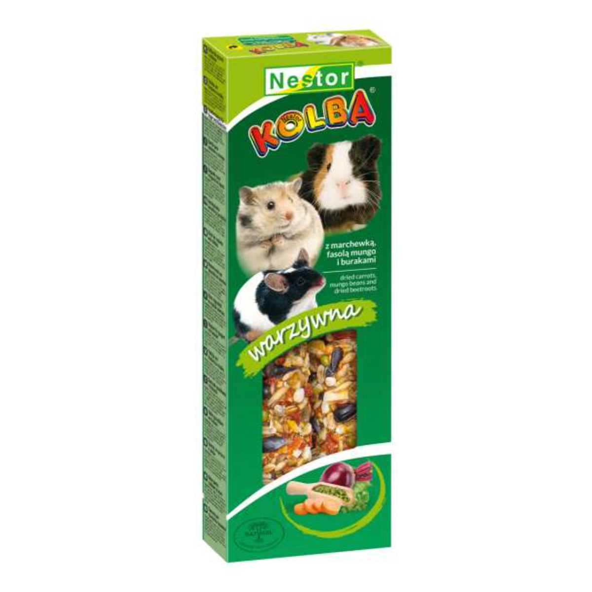Περιγραφή Κλασικό στικ-λιχουδιάς Nestor Kolba για κουνέλια και μικρά τρωκτικά με γεύση/περιεκτικότητα λαχανικών. Είναι ψημένη μπάρα με σπόρους που προσφέρει απασχόληση και εμπλουτισμό στο κλουβί, καθώς το ζώο ροκανίζει σταδιακά τους σπόρους. Ο ξύλινος πυρήνας συμβάλλει στη φυσική φθορά των κοπτήρων, βοηθώντας στη διατήρηση υγιών δοντιών. Ιδανικό ως συμπληρωματική τροφή/λιχουδιά για ποικιλία στη διατροφή.