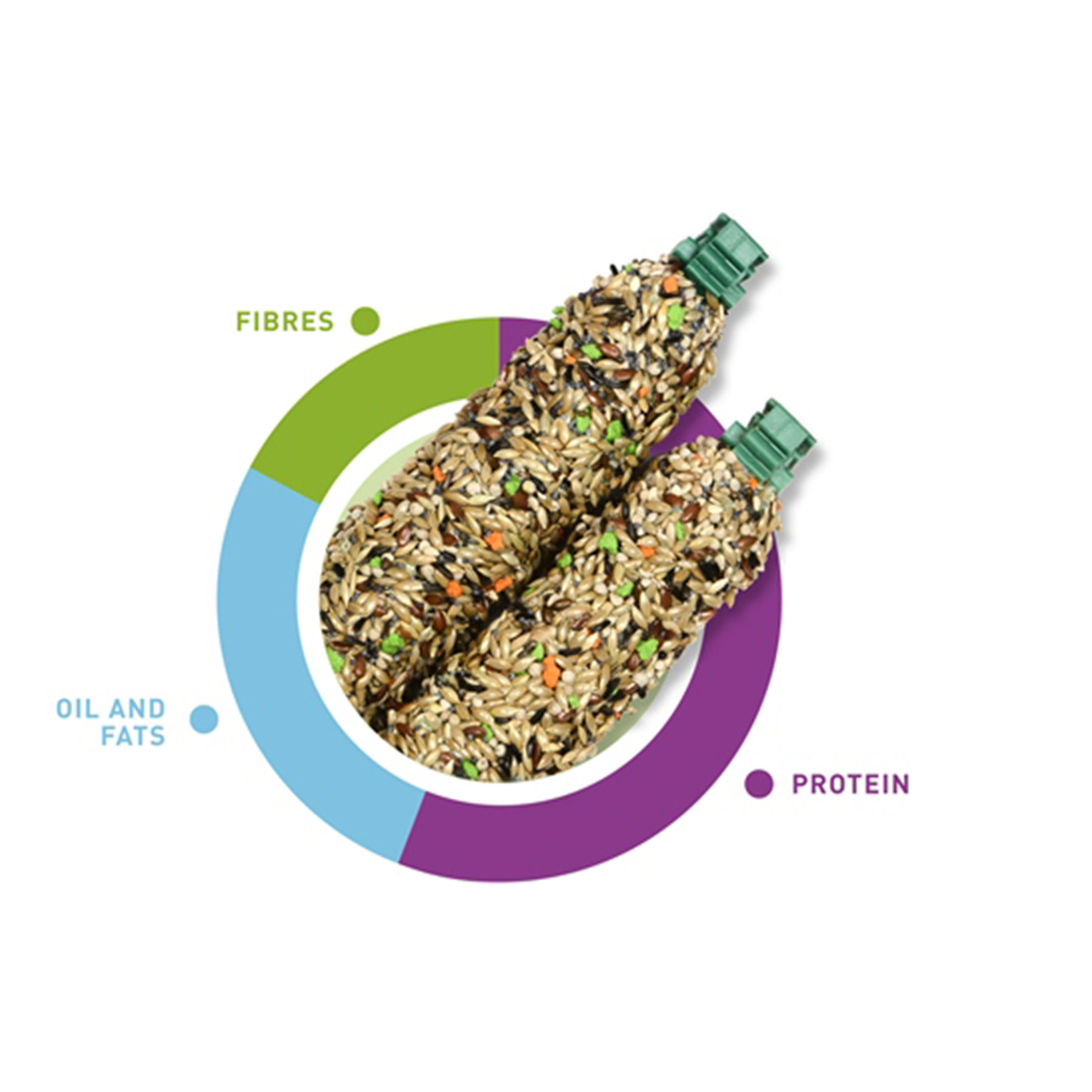 Ψιλοκομμένα ψητά στικ με λαχανικά και ποιοτικούς σπόρους, που χορηγούνται ως συμπλήρωμα στη συνήθη διατροφή των πτηνών.