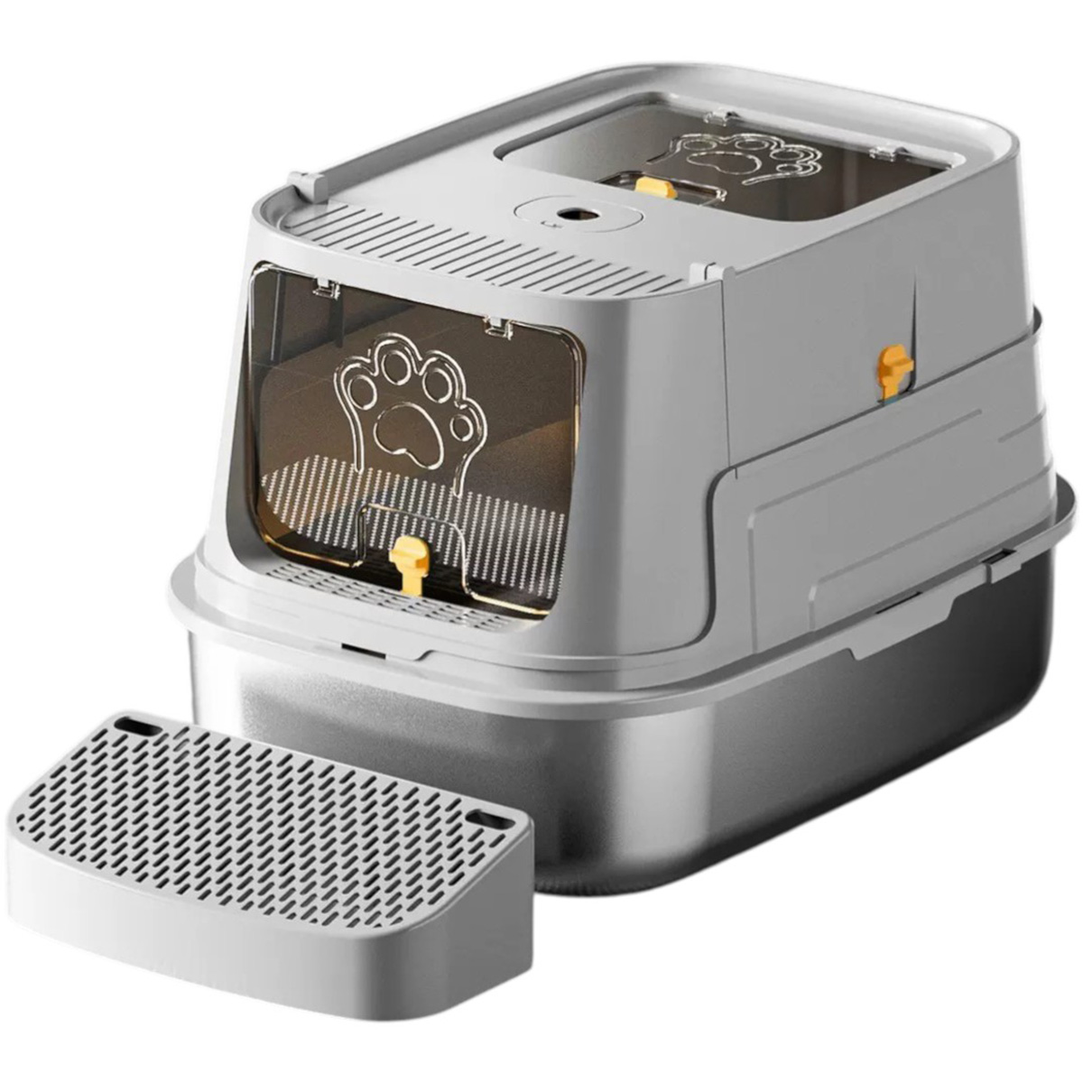 Σύστημα Συλλογής Άμμου (Step-on Grate): Το ειδικό αποσπώμενο σκαλοπάτι στην είσοδο καθαρίζει τα πατουσάκια της γάτας καθώς βγαίνει, κρατώντας το πάτωμά σας πεντακάθαρο.