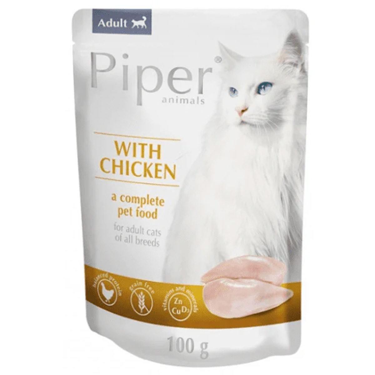 Υγρή τροφή χωρίς σιτηρά με κομμάτια κοτόπουλου, κατάλληλη για όλες τις ενήλικες γάτες. Είναι μια εξαιρετική τροφή, καθώς τα πρωτεϊνικά συστατικά που επιλέγονται κατά την παρασκευή της εξασφαλίζουν την υψηλότερη δυνατή περιεκτικότητα σε αμινοξέα, καθώς και τα υδατανθρακικά συστατικά που είναι υπεύθυνα για την πέψη των πρωτεϊνών και την απορρόφηση των αμινοξέων. Αυτή η τροφή είναι εύπεπτη και δεν επιβαρύνει το γαστρεντερικό σωλήνα της γάτας σας. Η σύνθεσή της καλύπτει το 100% της ζήτησης για όλα τα μέταλλα και βιταμίνες, εξασφαλίζει την καλή υγεία των οστών και των δοντιών, παρέχει φυσιολογικές μεταβολικές διεργασίες και, τέλος, λόγω των λιπαρών οξέων Ω3 και Ω6, διατηρεί το δέρμα και το τρίχωμα της γατούλας σας υγιές και λαμπερό, καθιστώντας το την ιδανική τροφή για τη μικρή μας φίλη.