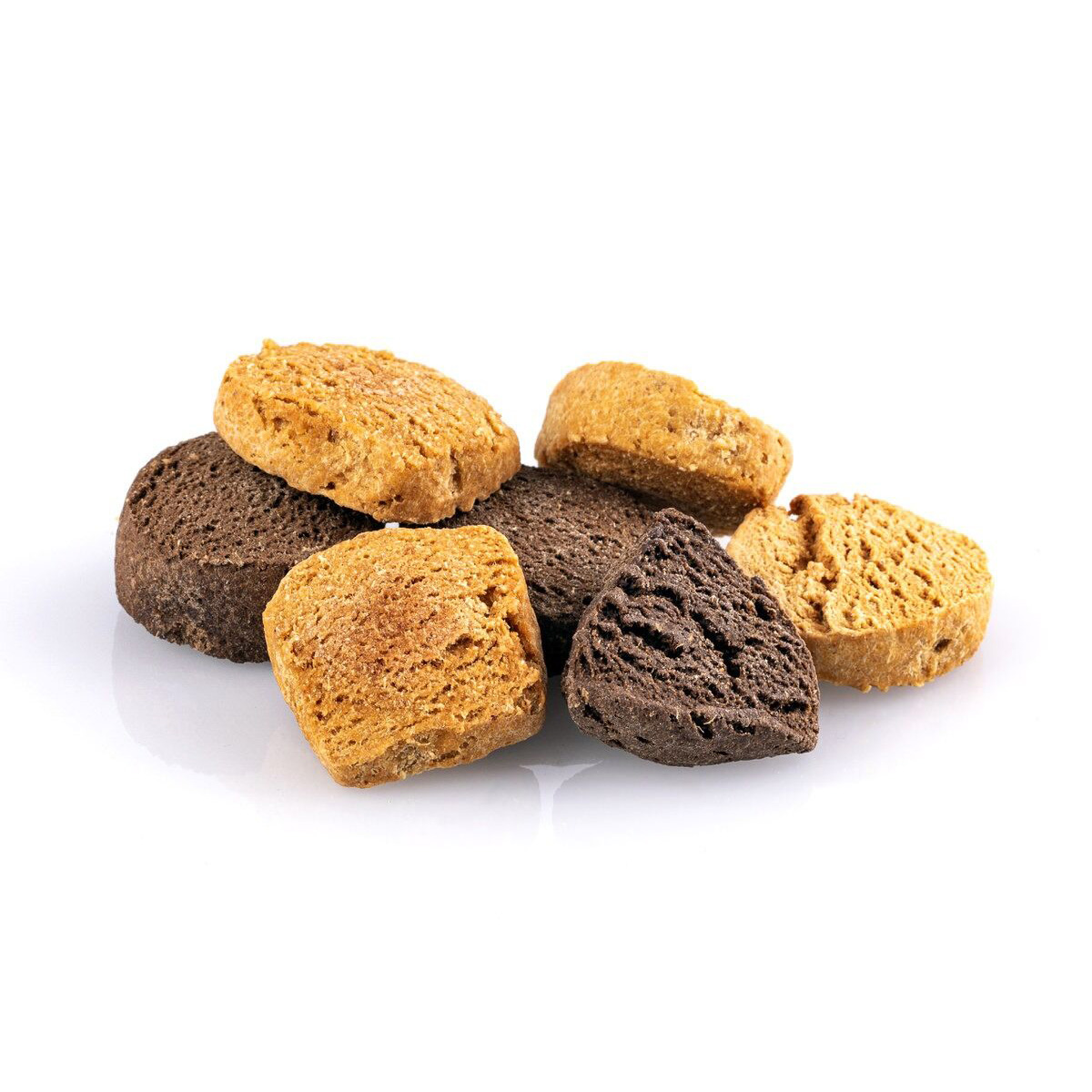 Μπισκότα λιχουδιών σκύλων με βανίλια και σοκολάτα, ιδανικά για εκπαίδευση ή επιβράβευση. Παρασκευάζονται χωρίς προσθήκη ζάχαρης, με χαμηλά λιπαρά και εύγευστη σύνθεση, κατάλληλη για καθημερινή χρήση ως συμπληρωματική τροφή.