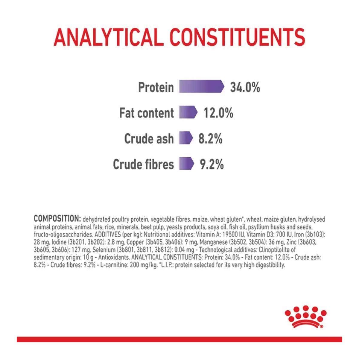 Αφυδατωμένη πρωτεΐνη πουλερικών, φυτικές ίνες, αραβόσιτος, γλουτένη σίτου*, σίτος, γλουτένη αραβοσίτου, υδρολυμένες ζωικές πρωτεΐνες, ζωικά λίπη, ρύζι, ανόργανα στοιχεία, πούλπα τεύτλων, προϊόντα ζυμών, έλαιο σόγιας, ιχθυέλαιο, ψύλλιο (σπόροι με φλοιό), φρουκτο-ολιγοσακχαρίτες