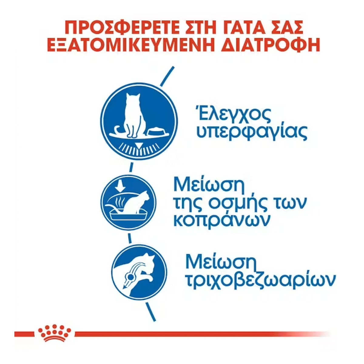 Πλήρης και ισορροπημένη τροφή για ενήλικες γάτες (1-7 ετών), που ζουν μέσα στο σπίτι και έχουν τάση υπερφαγίας.