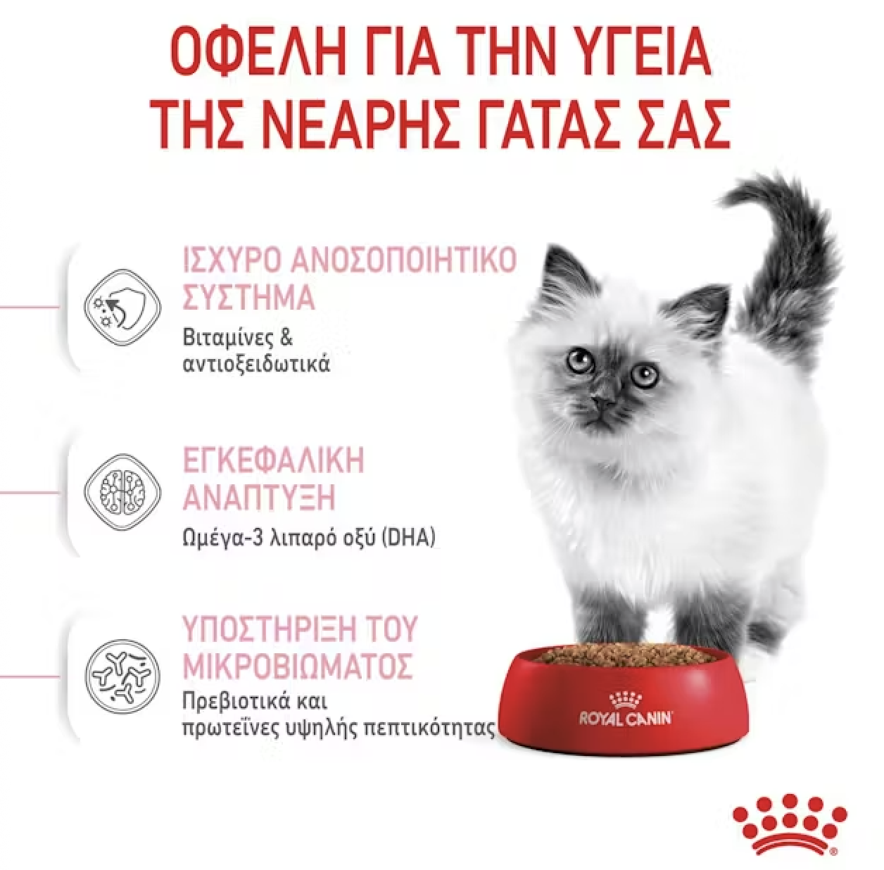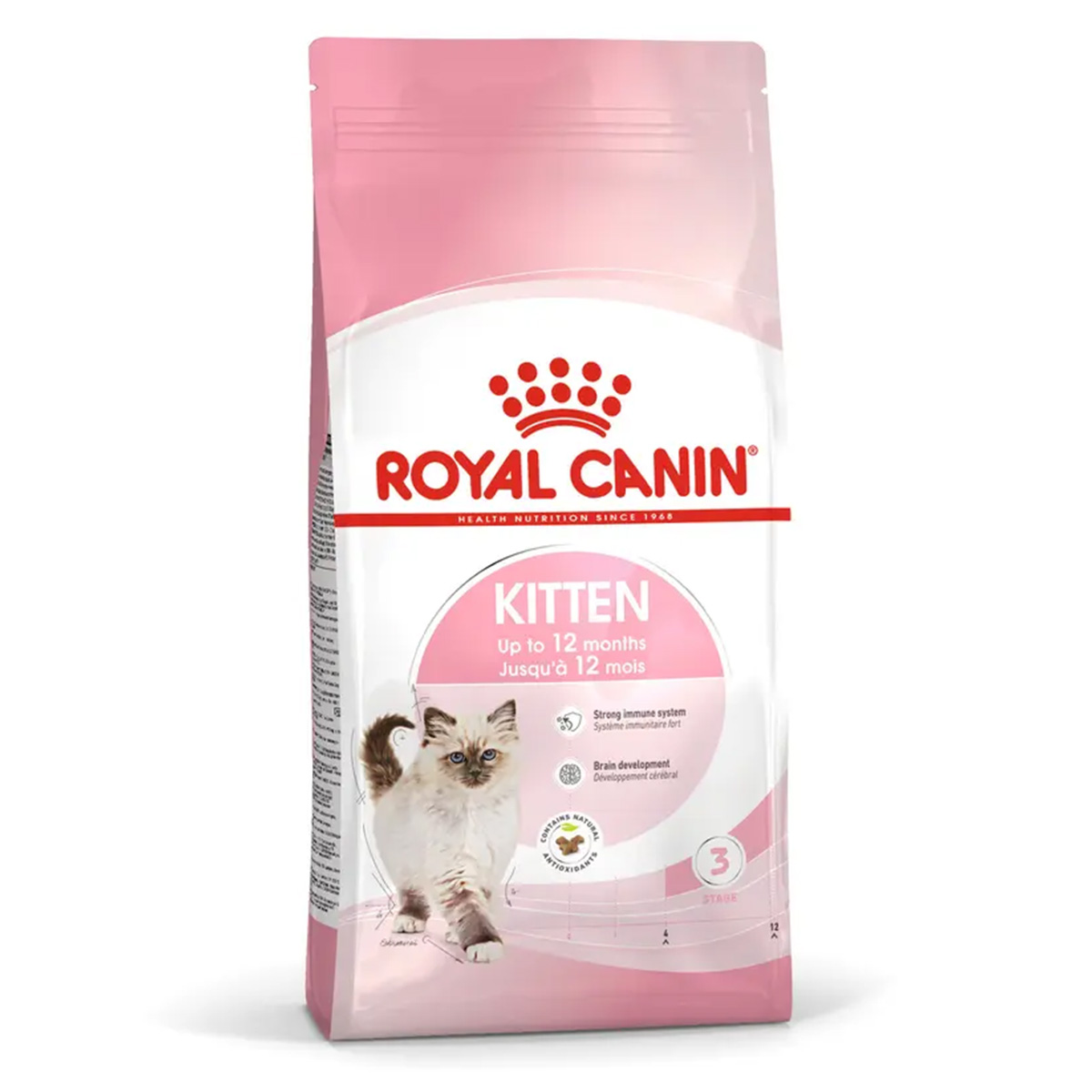 Η ROYAL CANIN® Kitten είναι ειδικά σχεδιασμένη για να υποστηρίζει τις διατροφικές ανάγκες των νεαρών γατών στη «φάση εδραίωσης» της ανάπτυξής τους. Αυτή η φόρμουλα είναι κατάλληλη για νεαρές γάτες από 4 έως 12 μηνών, καθώς υφίστανται μια περίοδο σημαντικών σωματικών και συμπεριφορικών αλλαγών. Αυτή η προσαρμοσμένη δίαιτα περιέχει προσαρμοσμένα επίπεδα πρωτεϊνών, ανόργανων στοιχείων και βιταμινών για να ικανοποιήσει τα αυξανόμενα επίπεδα ενέργειας της γάτας σας και να υποστηρίξει την ανάπτυξη των οστών και των μυών. Περιέχει επίσης θρεπτικά συστατικά όπως βιταμίνη C και Ε για να υποστηρίξει την ανάπτυξη του υγιούς ανοσοποιητικού συστήματος της νεαρής γάτας. Αυτά τα διατροφικά αντιοξειδωτικά έχει αποδειχθεί ότι διεγείρουν υψηλότερη και ταχύτερη αύξηση των αντισωμάτων μετά τον εμβολιασμό. Το ROYAL CANIN® Kitten είναι επίσης εμπλουτισμένο με Ωμέγα-3 λιπαρά οξέα (DHA) για την υποστήριξη της ανάπτυξης του εγκεφάλου και την ενίσχυση της υγιούς όρασης. Χάρη σε έναν συνδυασμό ωφέλιμων πρεβιοτικών (MOS) και εξαιρετικά εύπεπτων πρωτεϊνών, το ROYAL CANIN® Kitten βοηθά επίσης στην υποστήριξη της υγιούς ισορροπίας της εντερικής μικροχλωρίδας (χλωρίδα του εντέρου) για καλή πέψη. Η κροκέτα ROYAL CANIN® Kitten έχει επίσης σχεδιαστεί ειδικά για το μικρο στόμα της νεαρής γάτας σας. Ένα μηχανικό αποτέλεσμα βουρτσίσματος βοηθά στην υποστήριξη της οδοντικής υγείας, καθώς η νεαρή γάτα σας μασάει την τροφή της.Όταν η νεαρή γάτα σας φτάσει τους 12 μήνες, θα χρειαστεί μια δίαιτα που είναι ειδικά προσαρμοσμένη για να καλύψει τις διατροφικές της ανάγκες ως ενήλικη γάτα. Σε αυτό το στάδιο, μπορείτε να τη βοηθήσετε να μεταβεί στη σειρά τροφών ROYAL CANIN® για ενήλικες γάτες, που διατίθεται ως ξηρή ή υγρή τροφή σε σάλτσα, ζελέ ή υφή πατέ.