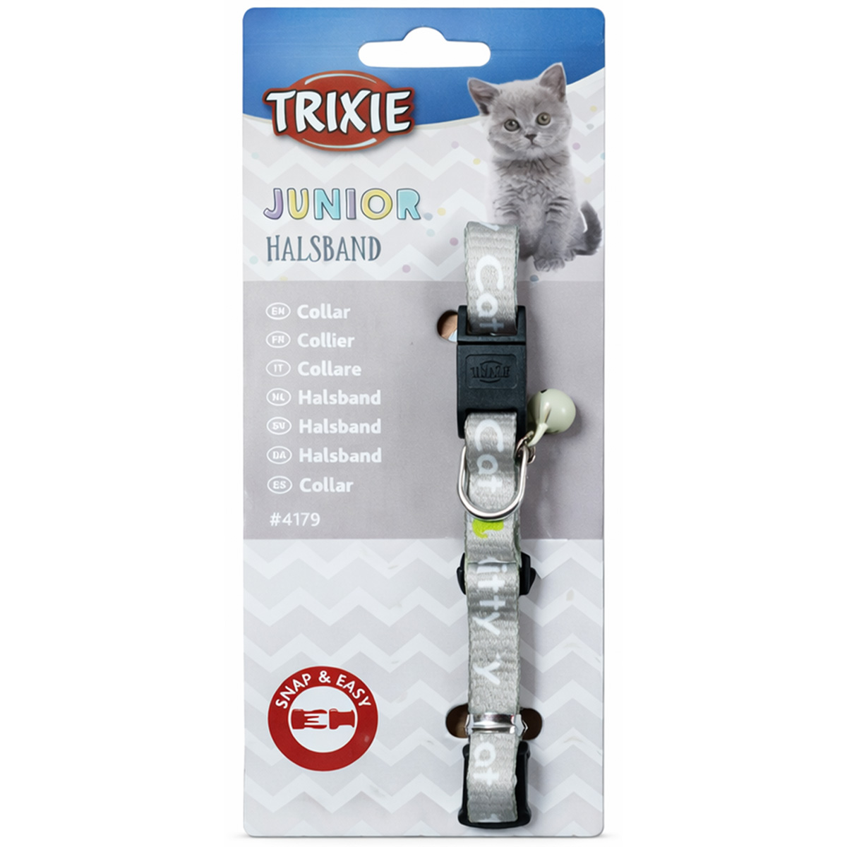 Trixie Junior Halsband (κωδικός #4179), περιλαίμιο ειδικά σχεδιασμένο για γατάκια και μικρόσωμες γάτες. Είναι κατασκευασμένο από ανθεκτικό νάιλον και διαθέτει το σύστημα ασφαλείας Snap & Easy, το οποίο επιτρέπει στο κολάρο να ανοίγει αυτόματα αν το γατάκι σκαλώσει κάπου, αποτρέποντας τον κίνδυνο τραυματισμού.