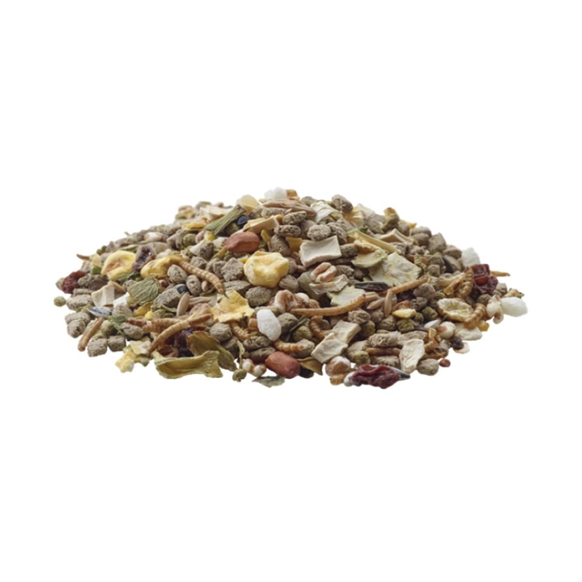 Σιτηρά (βρώμη 8%), σπόροι, παράγωγα φυτικής προέλευσης, λαχανικά (αρακάς 10%, παστινάκι 2%, πράσα 1%), εκχυλίματα φυτικών πρωτεΐνών, φρούτα (ανανάς 2%, σταφίδες 2%), έντομα (σκουλήκια 4%), ξηροί καρποί, ματαλλικά στοιχεία, βότανα, MOS, FOS, καλέντουλα, σπόροι σταφυλιών